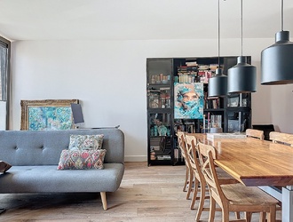 The living room with open kitchen offers enough space for a spacious sitting area and a large dining table, where you can enjoy delicious meals while admiring the beautiful architecture of the church.