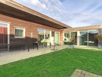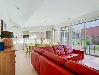 When you step inside the bungalow, you are greeted by a spacious hall with a separate toilet, meter cupboard and access to the night hall. The spacious 39 m² living room is the beating heart of the house. Large windows reach down to the floor and allow daylight to gently flood in, as if nature is smiling at you from outside. Open the sliding doors and let the garden become an extension of your living space. On chilly days, the cosy gas fireplace invites you to snuggle up under a warm blanket, with a good book or a glass of wine within reach.