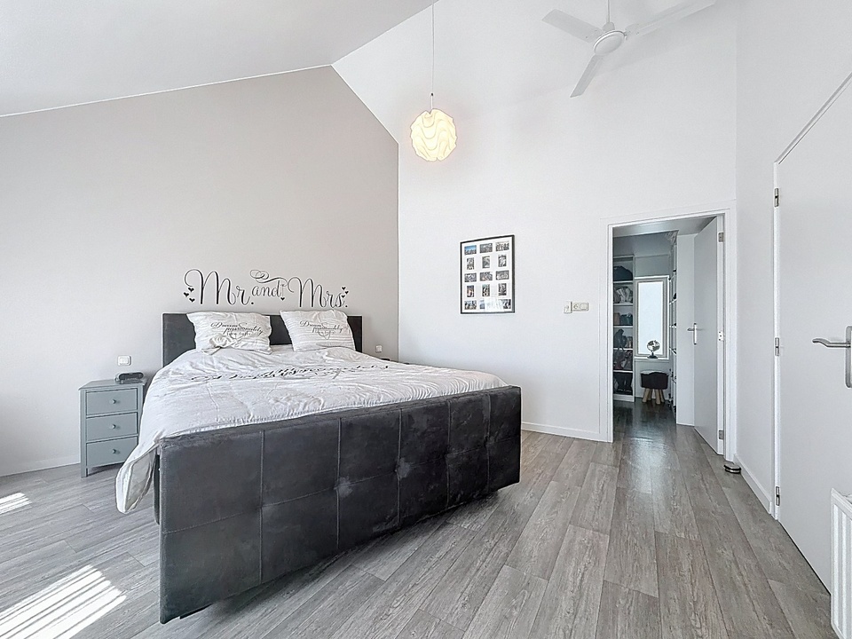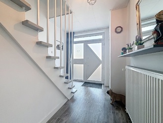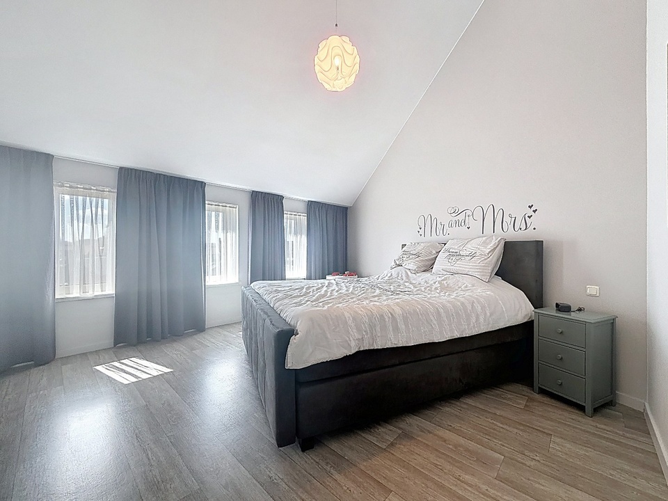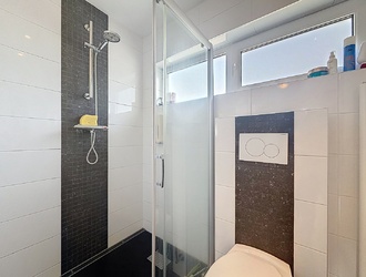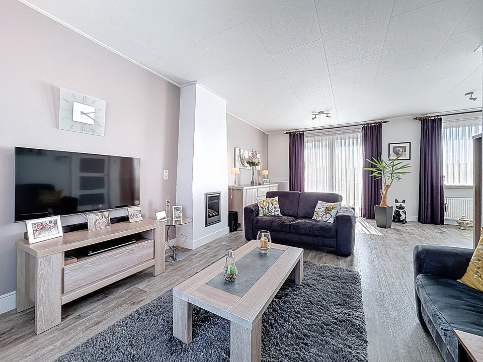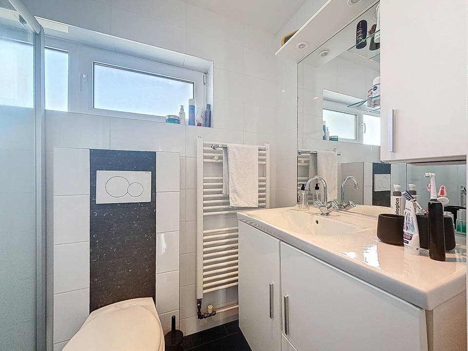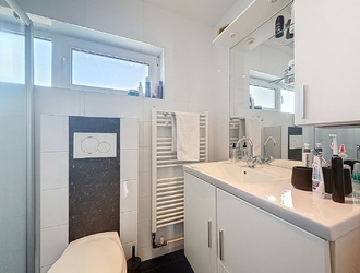 The ground floor – accessible at ground level from the front – welcomes you via the hall with meter cupboard (8 circuits) and staircase. The L-shaped living room of approximately 34 m² exudes atmosphere and comfort, with a stylish built-in gas fireplace as its warm focal point. Large windows at both the front and rear ensure a wonderful flood of natural light throughout the day. At the rear is a separate hallway with a toilet and access to the terrace, which spans the full width of the façade, where indoors and outdoors blend seamlessly.