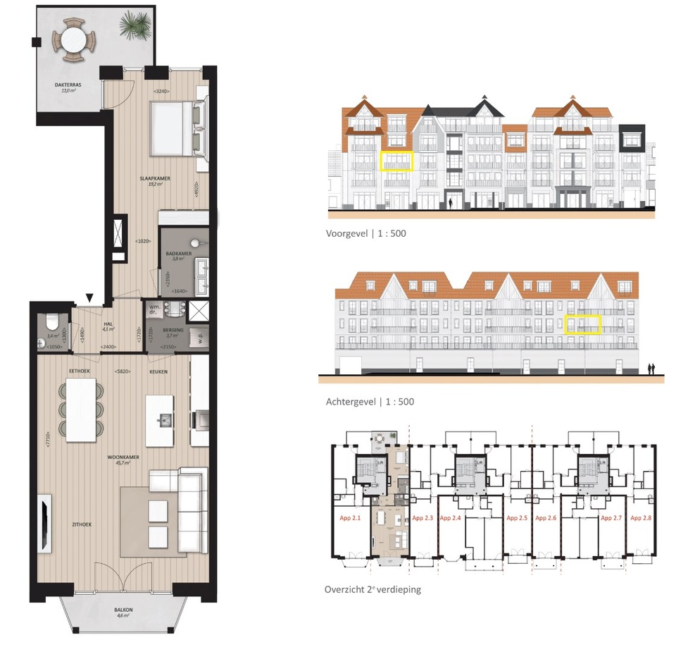 Ontdek de 23 appartementen, 3 penthouses, 7 woningen en 6 commerciële ruimtes die dit project omvat!