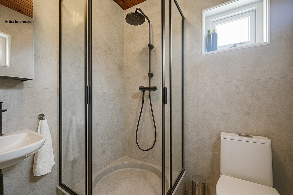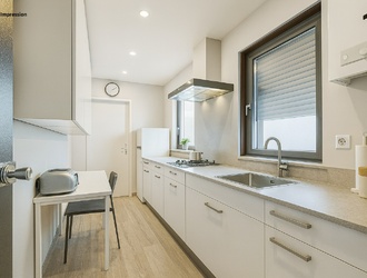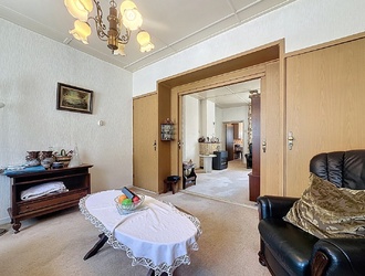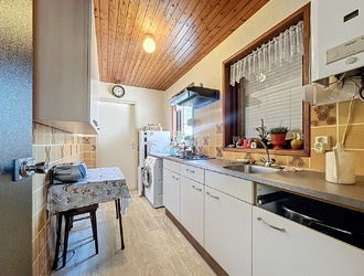 En passant par le jardin avant facile d'entretien, vous arrivez à la porte d'entrée accueillante. En entrant, vous accédez au hall, où se trouvent un espace pour un porte-manteau, le compteur électrique et l'escalier menant au premier étage. Le spacieux salon d'environ 36 m² offre la possibilité de séparer ou de réunir les espaces salon et salle à manger grâce à une porte coulissante. Attenant à la maison, vous trouverez la cuisine pratique, équipée d'une cuisinière à gaz, d'une hotte, d'un évier simple et d'une connexion pour la machine à laver. Derrière la cuisine se trouve la salle de bains, équipée d'une cabine de douche, d'un lavabo et de toilettes.