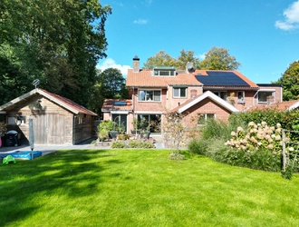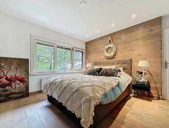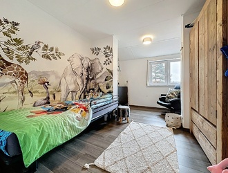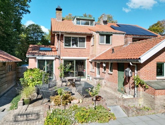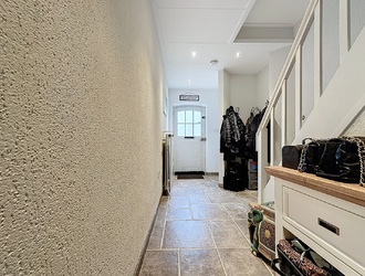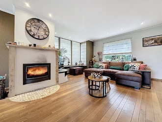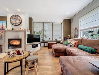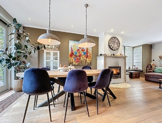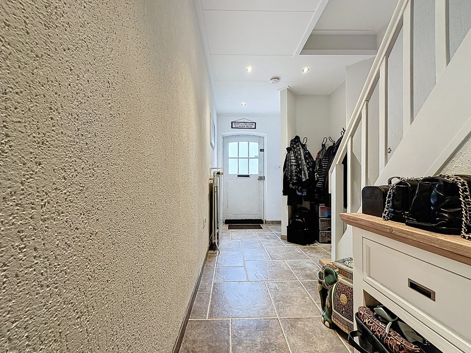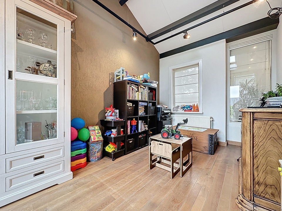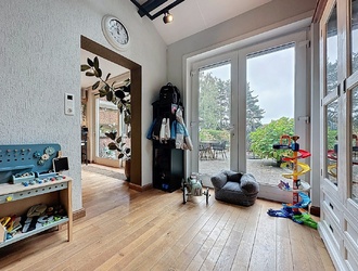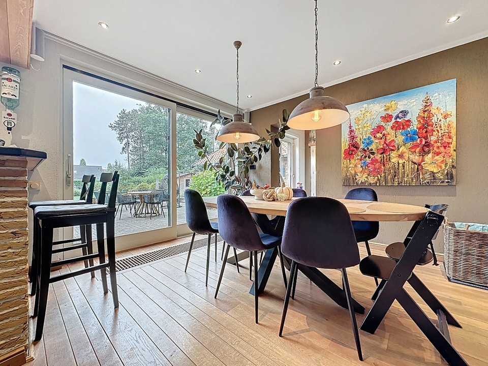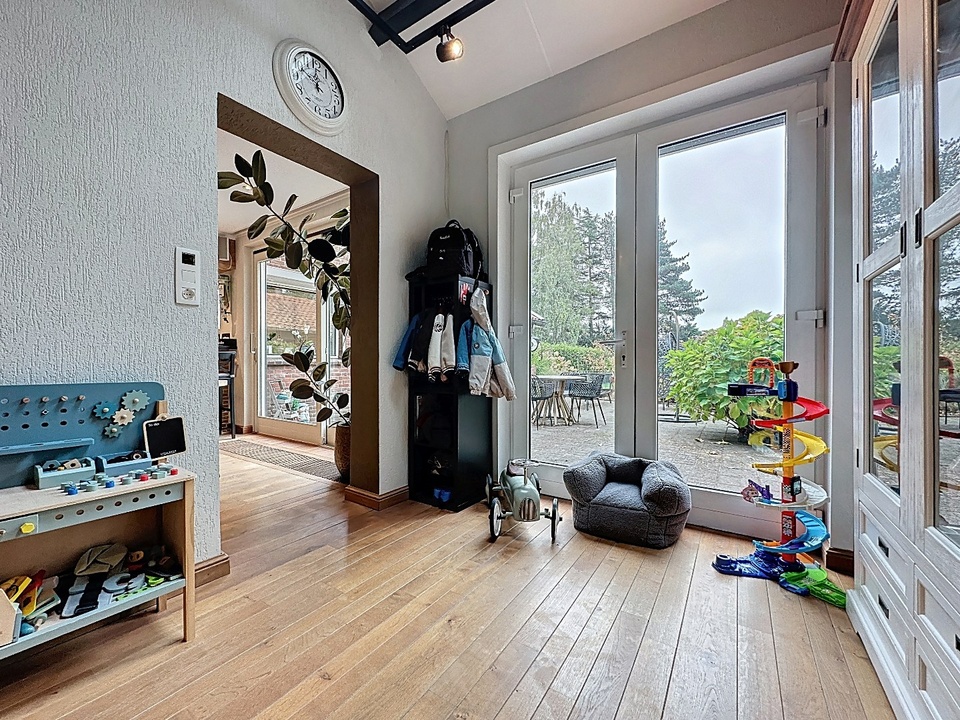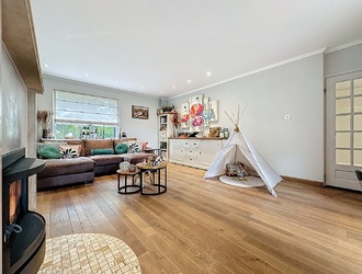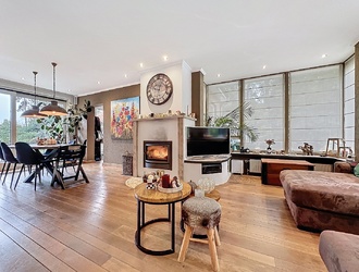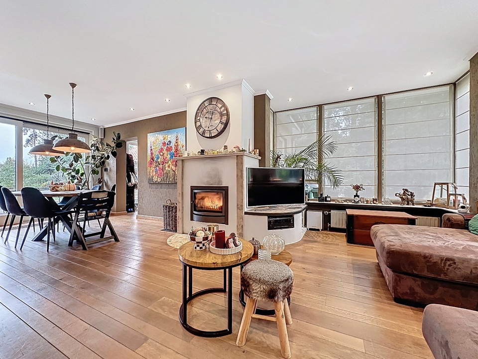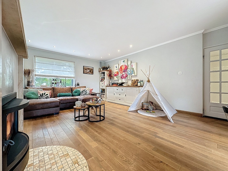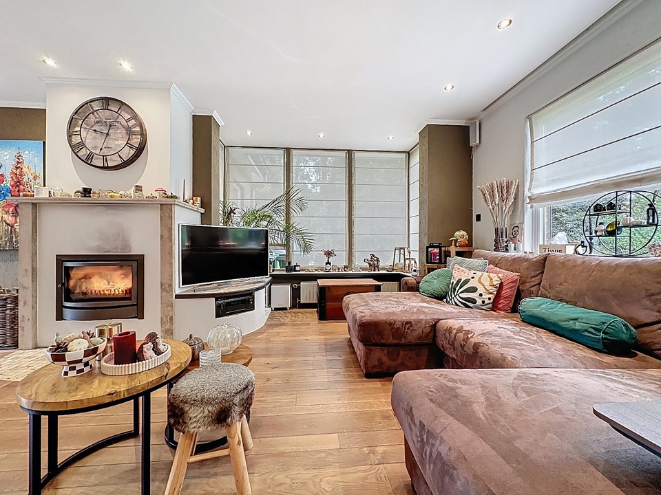 Dès l'entrée, vous remarquerez immédiatement l'espace de vie spacieux et lumineux. De grandes fenêtres de plusieurs côtés offrent une abondance de lumière naturelle et une vue agréable sur l'environnement verdoyant. La disposition est pratique et accueillante, idéale pour des moments en famille ou une soirée tranquille à la maison. Le charmant foyer au centre de la maison ne peut pas manquer.