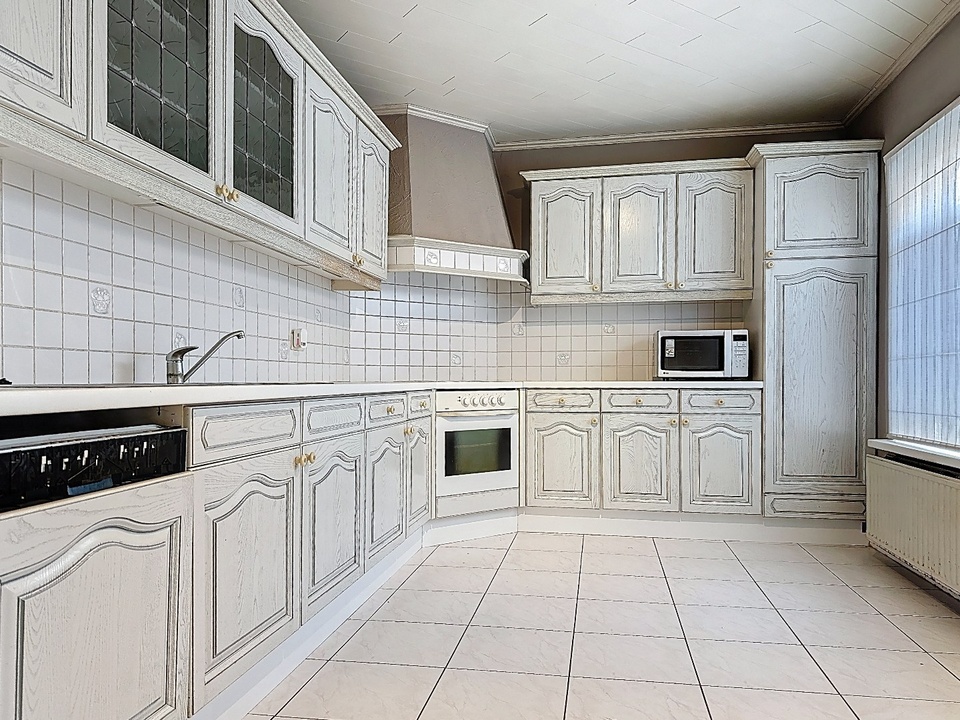 De lichte en uitnodigende woonkamer vormt het hart van het huis, met grote raampartijen die zorgen voor een aangename natuurlijke lichtinval. Aansluitend bevindt zich de functionele keuken, die voldoende ruimte biedt voor koken en samenkomen.