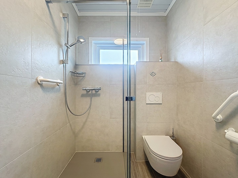 Rechts gelegen van de keuken vindt u de badkamer met douche, toilet en enkele wastafel. De ruimte is daarnaast voorzien van mechanische ventilatie. Parallel aan de hal vindt u de knusse woonkamer welke langs twee kanten te bereiken is. Hier is het de open haard die avonden extra sfeervol kan maken.