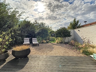 De openslaande stalen deuren in de woonkamer geven toegang naar het terras en de half in grind aangelegde tuin op het zuidwesten. De diepe tuin is verder voorzien van een kleine boomgaard en grasveld. De tuin is bereikbaar via een poort vanaf de straatzijde.