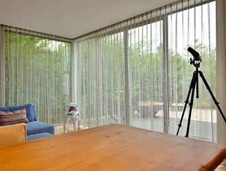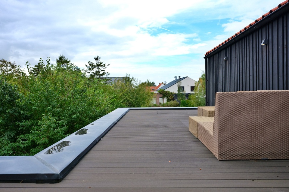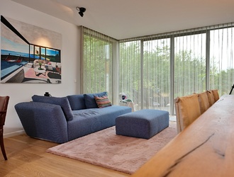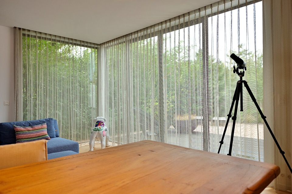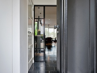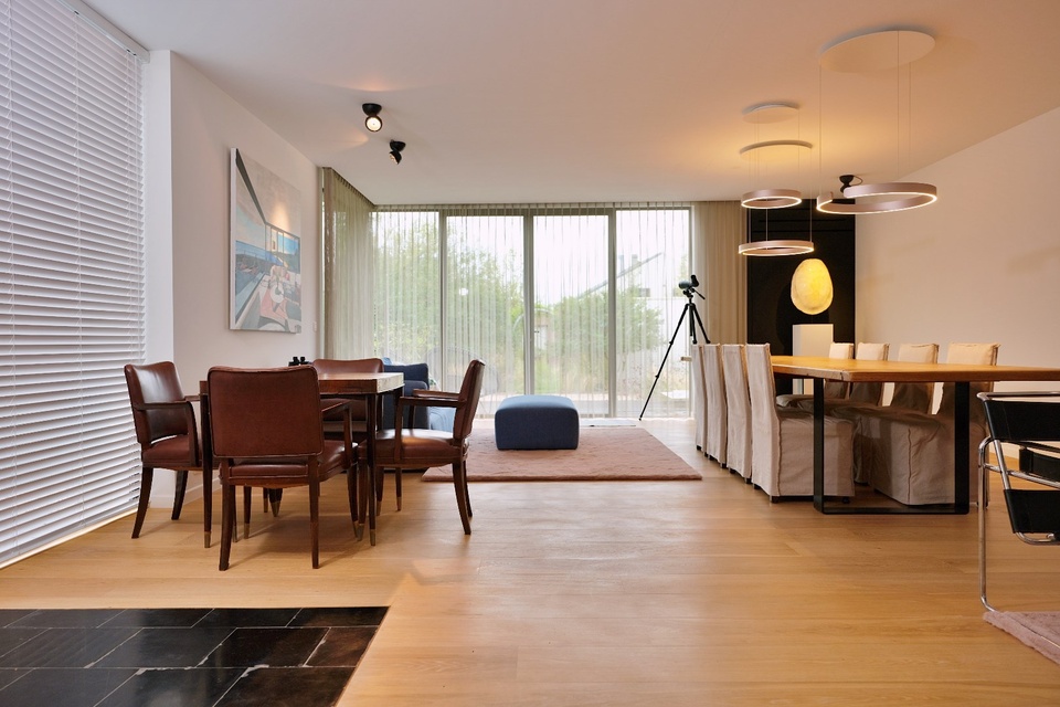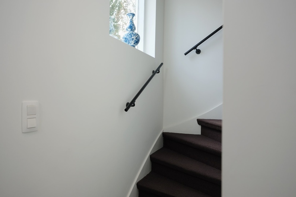 Door de vele grote ramen betrekt het interieur veel licht wat ruimte geeft aan de woning. De achtergevel op het gelijkvloers is voorzien van stalen ramen die een open zicht geven op de tuin en een binnen-buiten ervaring geven als je binnen bent.