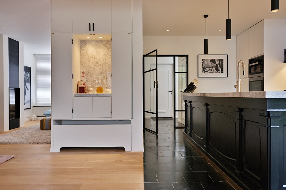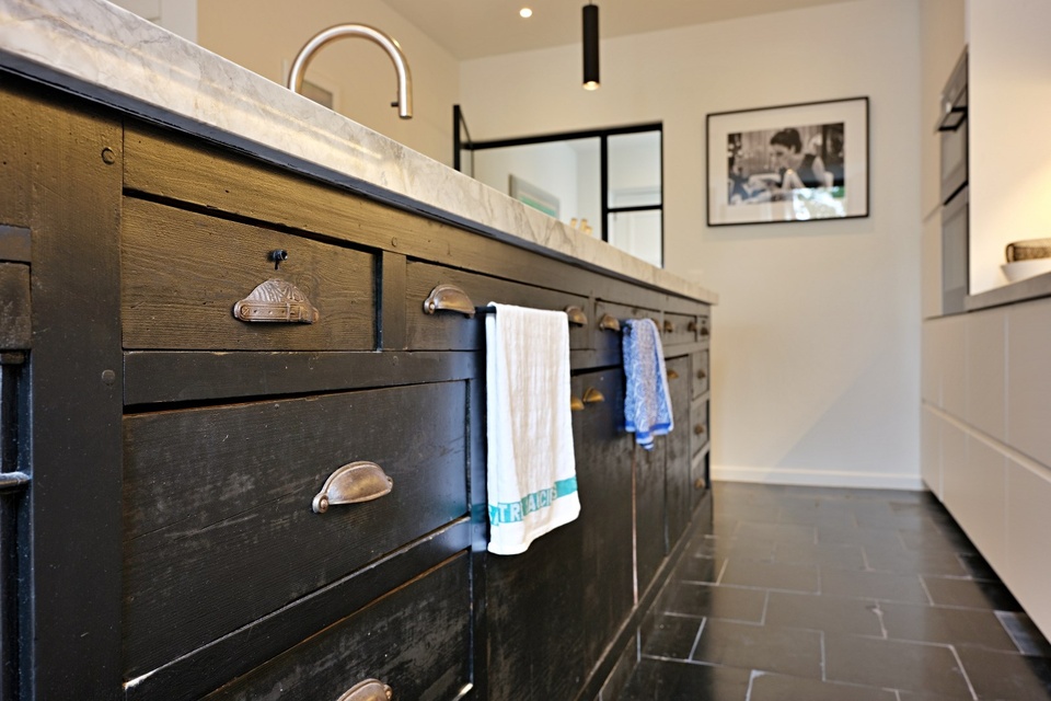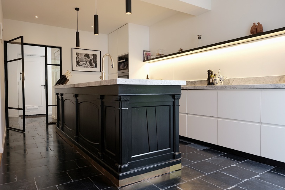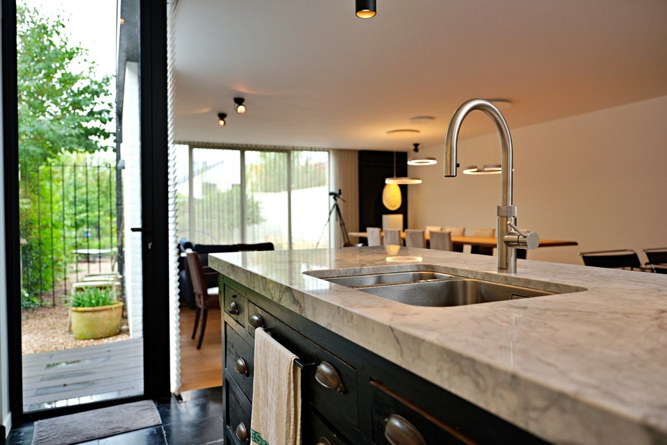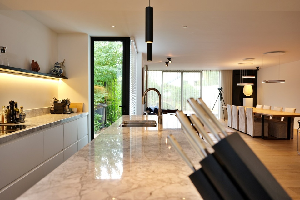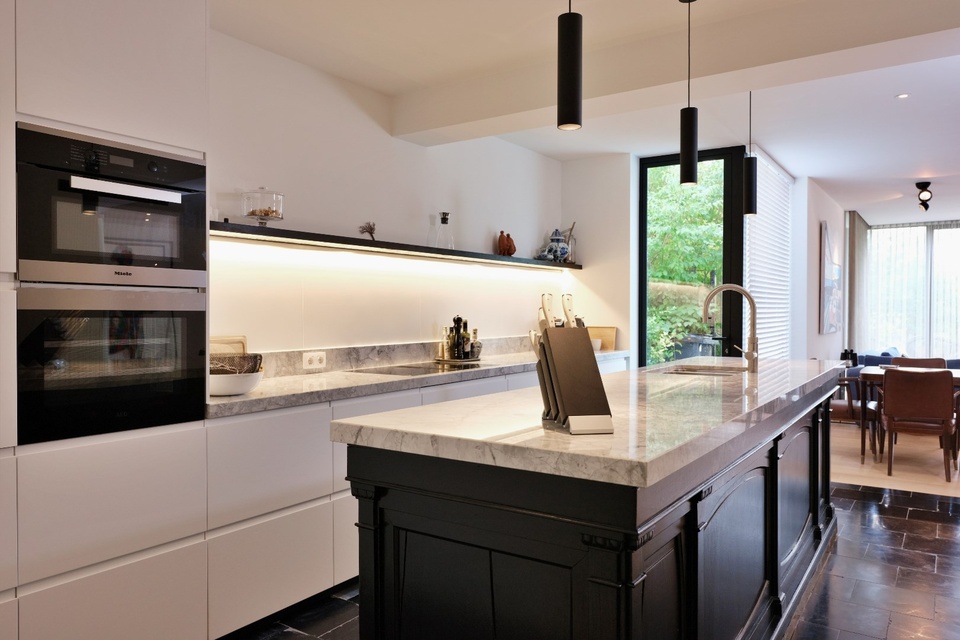De open keuken met eiland en prachtig marmer werkblad is volledig ingericht en ook voorzien van een wijnklimaatkast. Ook hier het gebruik van authentieke interieurdelen gecombineerd met een moderne uitstraling. Vanuit de keuken heb je een open zicht in de eet- en leefruimte. De ruime woonkamer biedt plaats aan diverse zithoeken en een grote eettafel. Het open gevoel wordt nog versterkt door de achter- en zijgevel die volledig in glas zijn uitgevoerd. Rechtstreeks contact met de tuin versterkt het ruimtegevoel en de designverlichting is gebalanceerd om ook bij winterse dagen een warme sfeer in huis te geven.