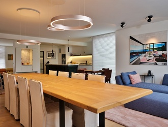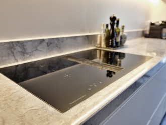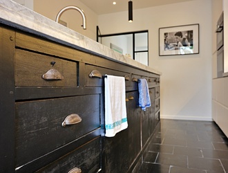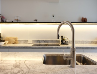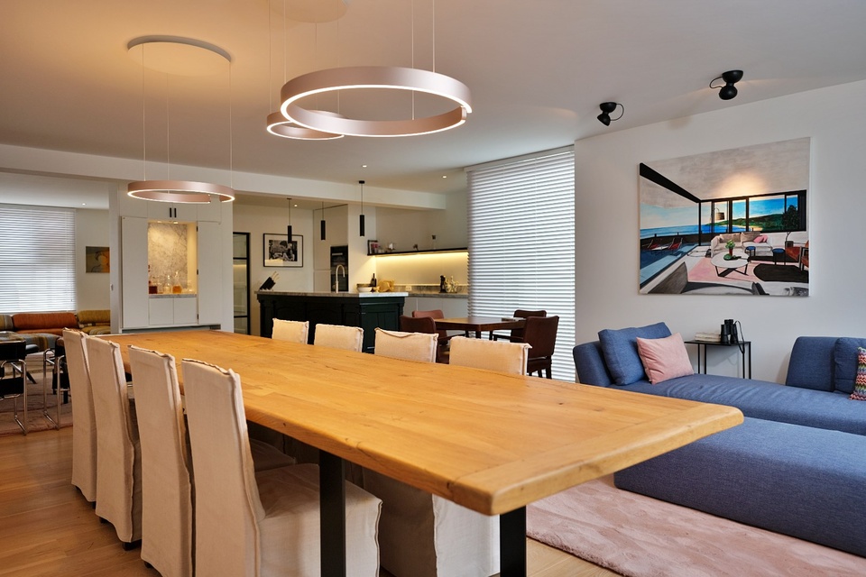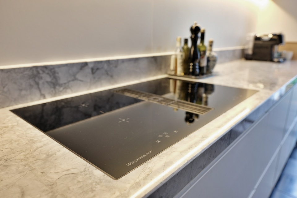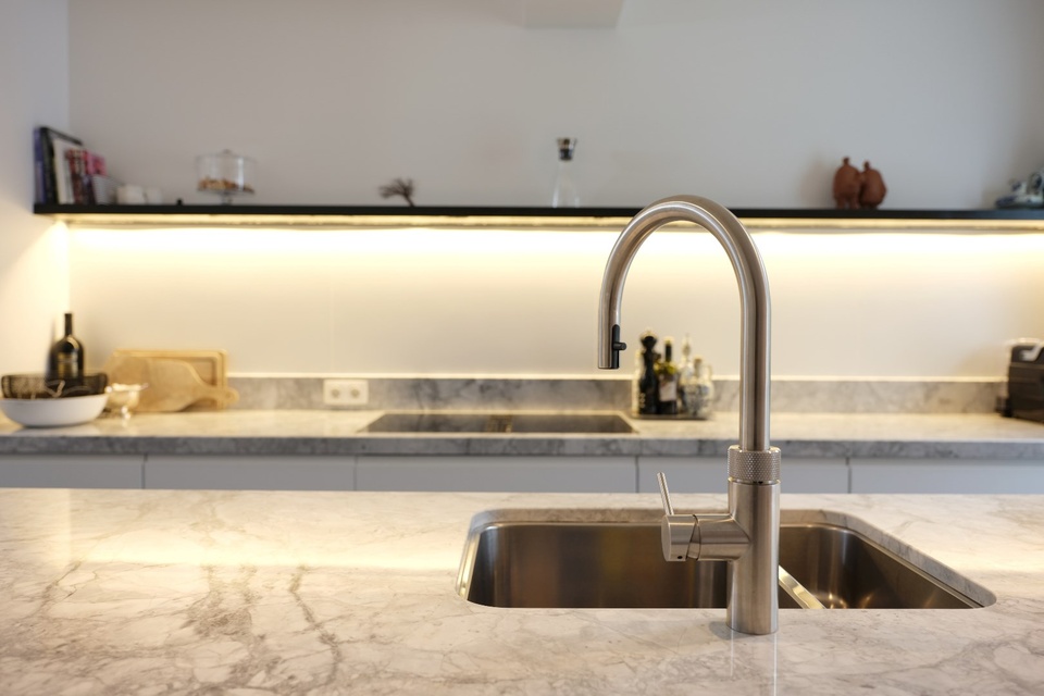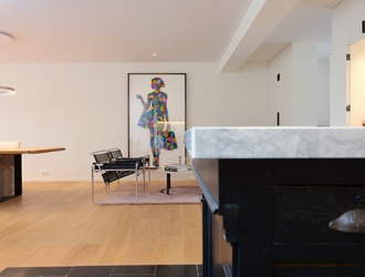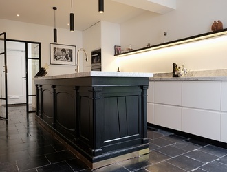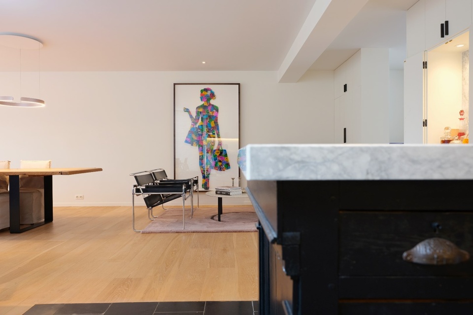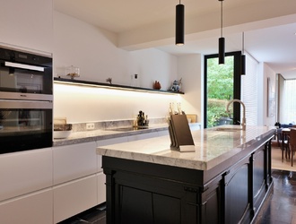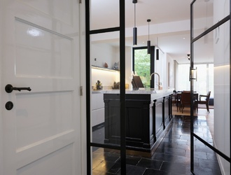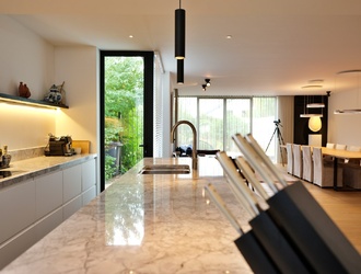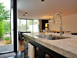 De open keuken met eiland en prachtig marmer werkblad is volledig ingericht en ook voorzien van een wijnklimaatkast. Ook hier het gebruik van authentieke interieurdelen gecombineerd met een moderne uitstraling. Vanuit de keuken heb je een open zicht in de eet- en leefruimte. De ruime woonkamer biedt plaats aan diverse zithoeken en een grote eettafel. Het open gevoel wordt nog versterkt door de achter- en zijgevel die volledig in glas zijn uitgevoerd. Rechtstreeks contact met de tuin versterkt het ruimtegevoel en de designverlichting is gebalanceerd om ook bij winterse dagen een warme sfeer in huis te geven.