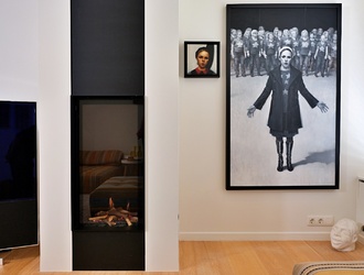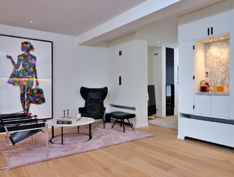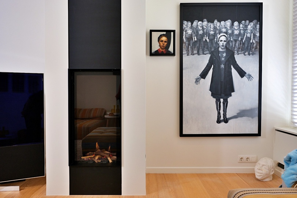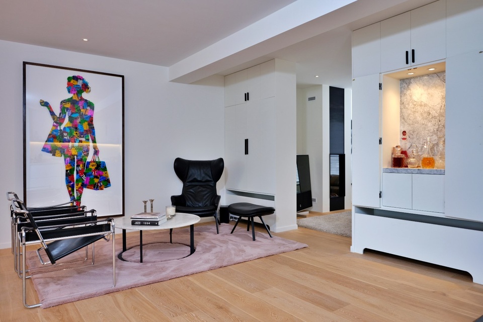 Aan de voorkant van de woning is er een loungehoek/tv-kamer met open haard gerealiseerd. Deze ruimte is prachtig afgewerkt met ingebouwde kasten en inbouwverlichting.
