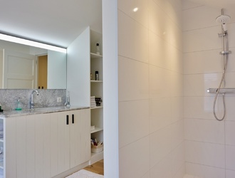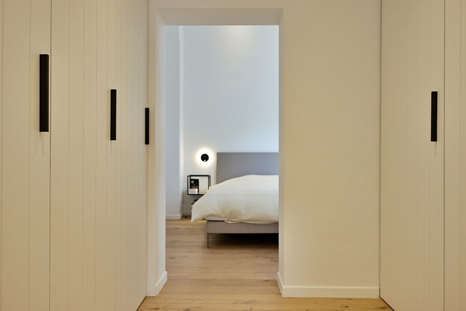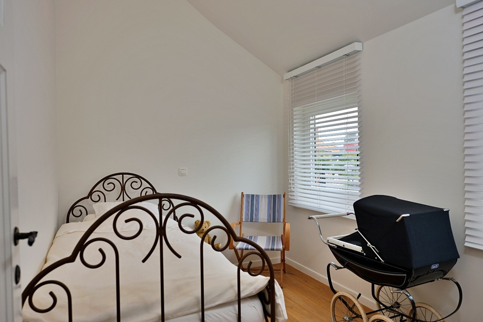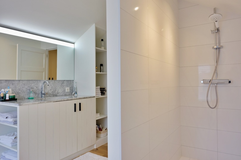 Op de 1e verdieping bevindt zich aan de achterzijde een eerste slaapkamer geschikt voor een dubbel bed, de master bedroom met grote dressing en aansluitende badkamer zijn voorzien van modern ligbad, inloopdouche en wastafelmeubel. Vanuit deze slaapkamer is er ook toegang naar het dakterras. Een derde, kleinere slaapkamer geschikt als kinderslaapkamer of bureau, bevindt zich aan de straatzijde. Apart toilet en douchekamer zijn toegankelijk via de overloop.