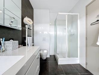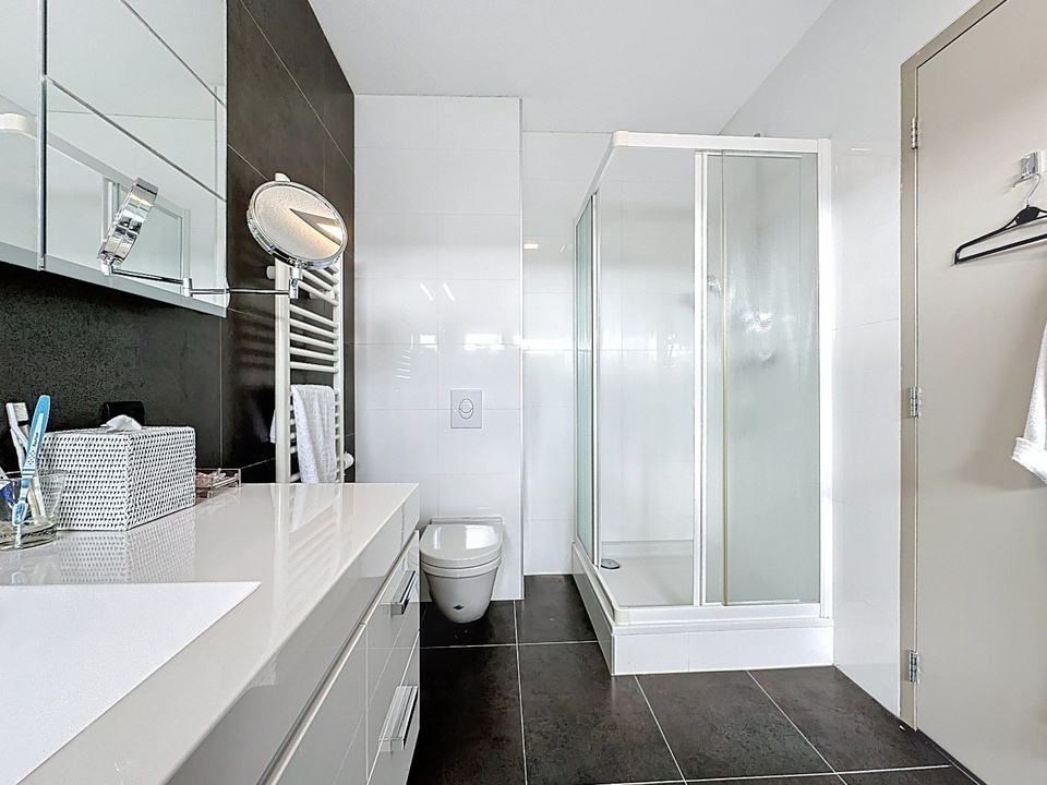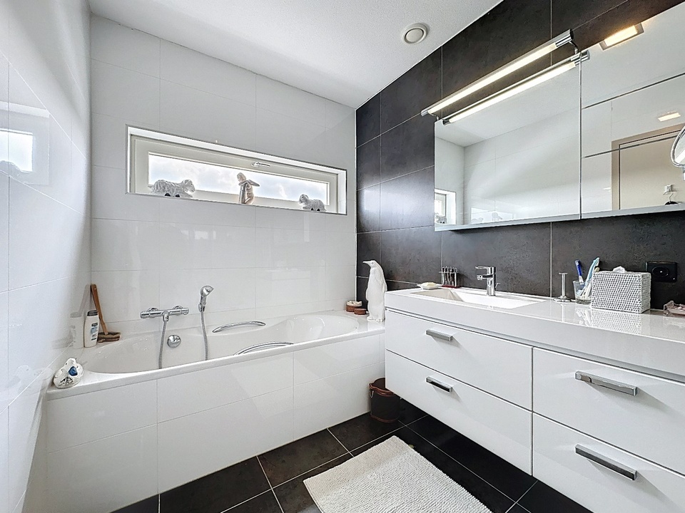 De twee slaapkamers hebben elk een badkamer en suite ingericht met toilet, wastafelmeubel en bad en één badkamer nog met extra douchecabine.