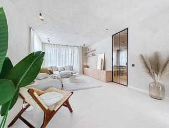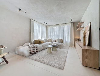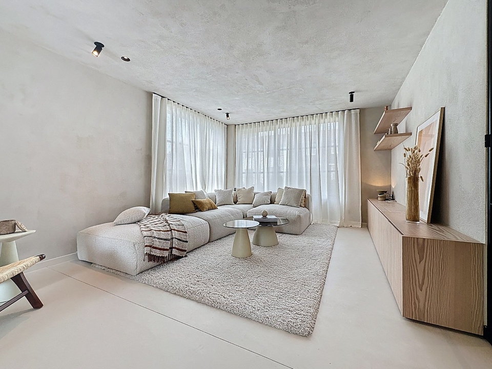 Binnen word je verwelkomd door een ruime hal met een apart toilet, praktische vestiaireruimte en ingebouwde kasten die je garderobe stijlvol opbergen. Een elegante gietijzeren deur met glas leidt je naar de lichte leefruimte, waar de betonnen vloer en grote ramen een open en uitnodigend gevoel creëren. De open woonkeuken, compleet met ontbijtbar, dubbele spoelbak en inbouwapparatuur, is de perfecte plek voor gezellige momenten en intieme diners. Een knusse zithoek met lage kastenwand completeert deze ruimte, allemaal strak geschilderd en sfeervol verlicht met opbouw- en inbouwverlichting die een warme ambiance schept.