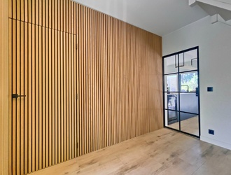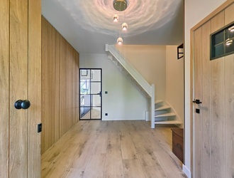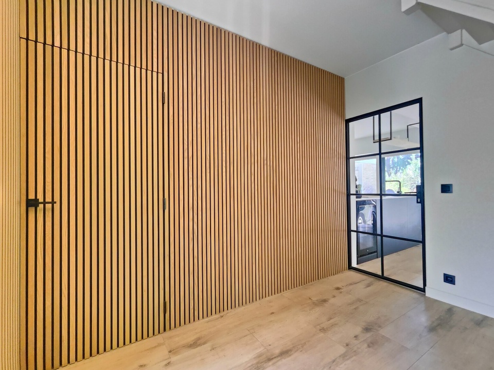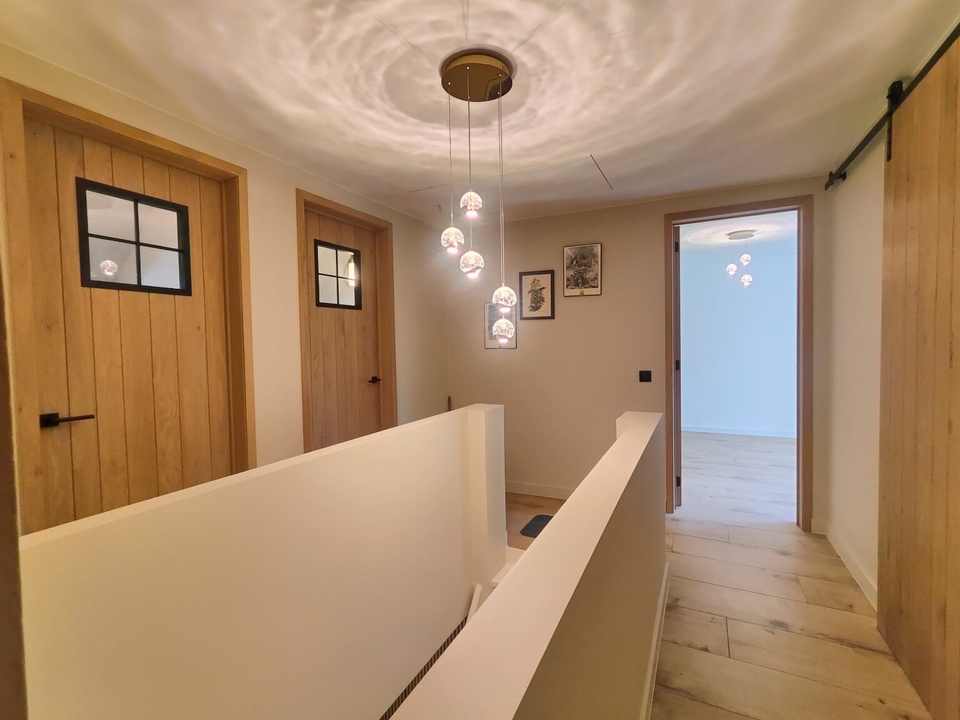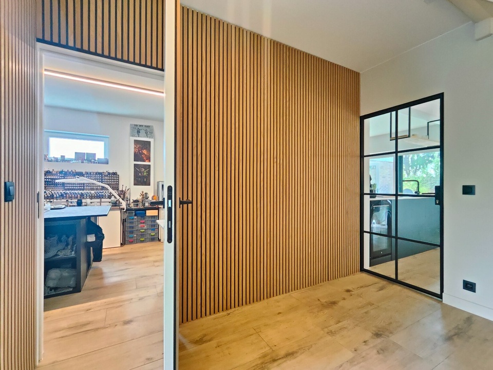 Bij binnenkomst word je verwelkomd door een elegante centrale entreehal die direct de sfeer van comfort en stijl uitstraalt. De op maat gemaakte akoestische wand geeft een warme, luxe touch en leidt je naar de multifunctionele ruimte, perfect voor hobby’s of creatieve invullingen. De royale ontvangsthal herbergt een modern toilet, de meterkast en de trap die je naar de eerste verdieping brengt, allemaal afgewerkt met hoogwaardige materialen.