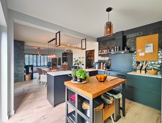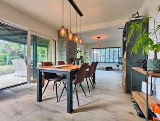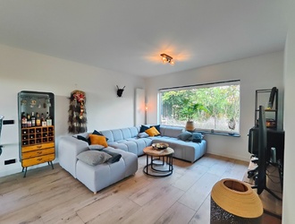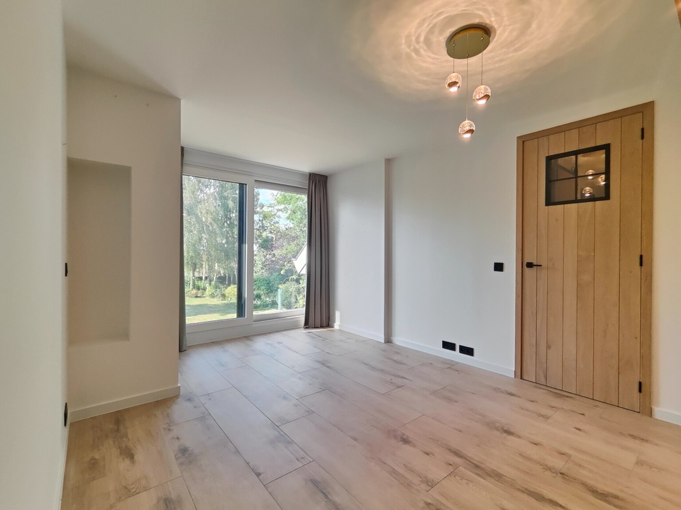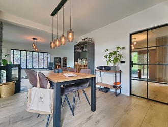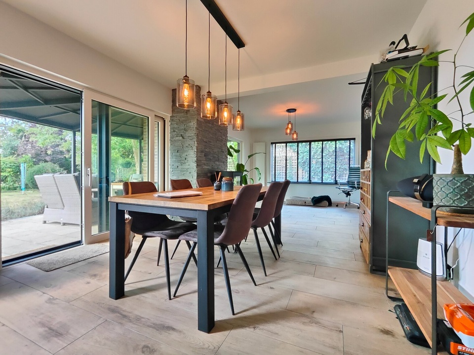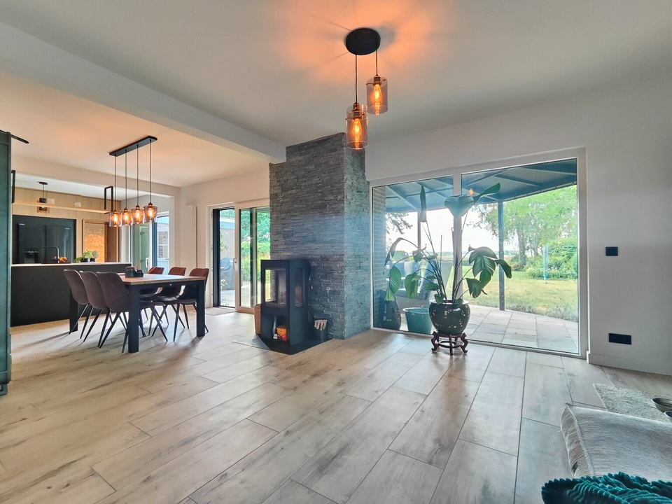 De tuingerichte living is een waar pronkstuk: een lichte, open ruimte van ca. 91 m² met grote schuifpuien die binnen en buiten naadloos verbinden. Hier geniet je van een adembenemend uitzicht op de aangelegde bostuin en de uitgestrekte polder, terwijl de Italiaanse keramische vloer warmte en sfeer brengt. De ruimte is verdeeld in twee gezellige zithoeken: een knusse tv-hoek en een relax- of leeshoek met een sfeervolle houthaard, ideaal voor ontspannen avonden of intieme gezelschappen.