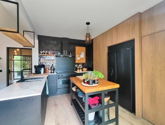De stralende keuken is een ware eyecatcher, voorzien van een centraal eiland, een Bertazzoni fornuis met grote oven, wijnkoeler en een Amerikaanse ijskast met ijsblokjes. Volledig uitgerust met hoogwaardige A+ inbouwapparatuur van ATEG, nog onder garantie, en met een schuifpui die de keuken laat overvloeien in de tuin. Achter de keuken bevindt zich de inpandige garage, handig voor opslag en automobiel.