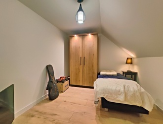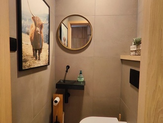 De volledig gerenoveerde badkamer is een oase van comfort en stijl: voorzien van een vrijstaand ligbad, een inloopdouche met donker gerookt glas en rainshower, dubbele lavastenen wastafels op een eiken badkamerkast, en een Velux-raam dat de ruimte vult met natuurlijk licht, en een hangtoilet. Een perfecte plek om te ontspannen en tot rust te komen.