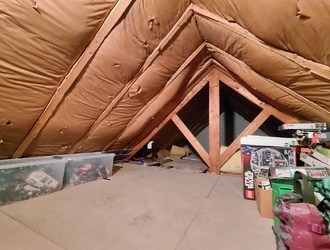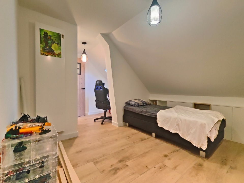 Via een vlizotrap bereik je de ruime vliering, die zich uitstrekt over de volledige lengte van de woning en veel extra bergruimte biedt.