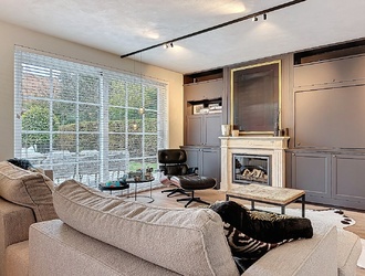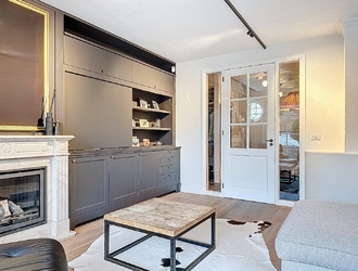 De salon biedt volop ruimte voor een grote zithoek met comfortabele sofa’s en fauteuils. De sfeervolle gashaard is fraai geïntegreerd in maatwerkkasten, wat zorgt voor een rustig en harmonieus geheel.