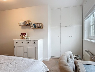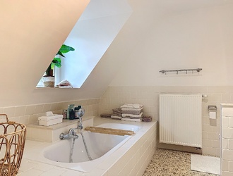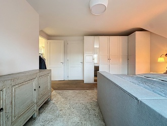 De master bedroom is royaal opgezet en beschikt over een badkamer en suite met ligbad, dubbele wastafel en toilet. De warme materialen en landelijke stijl zorgen hier voor een rustgevende, wellness-achtige sfeer.