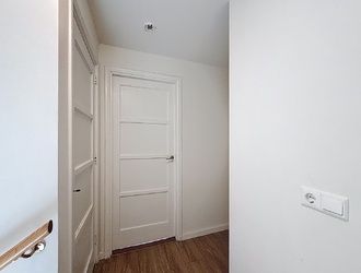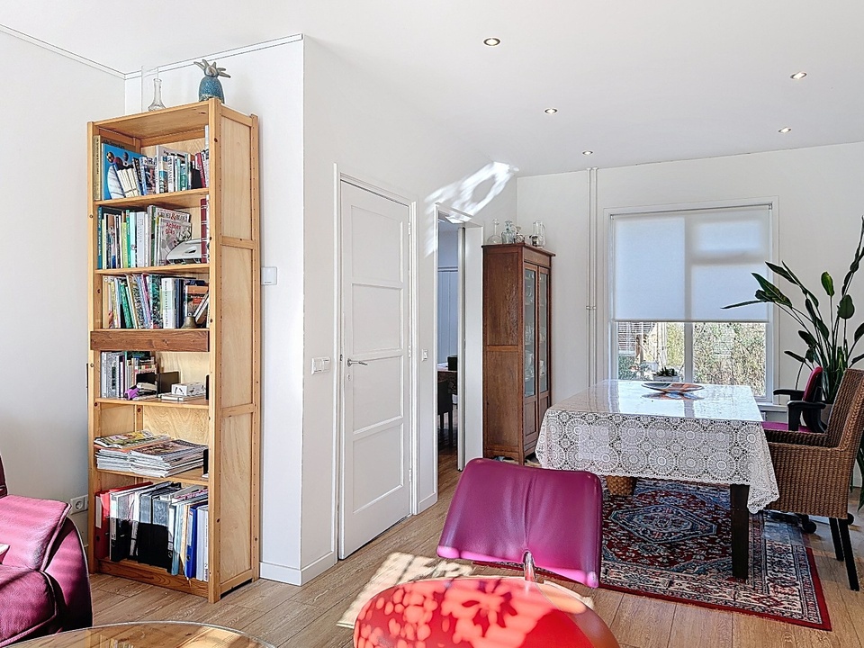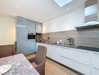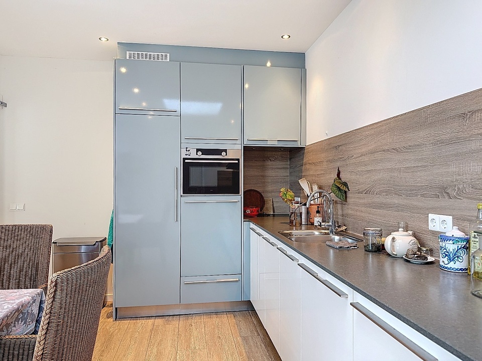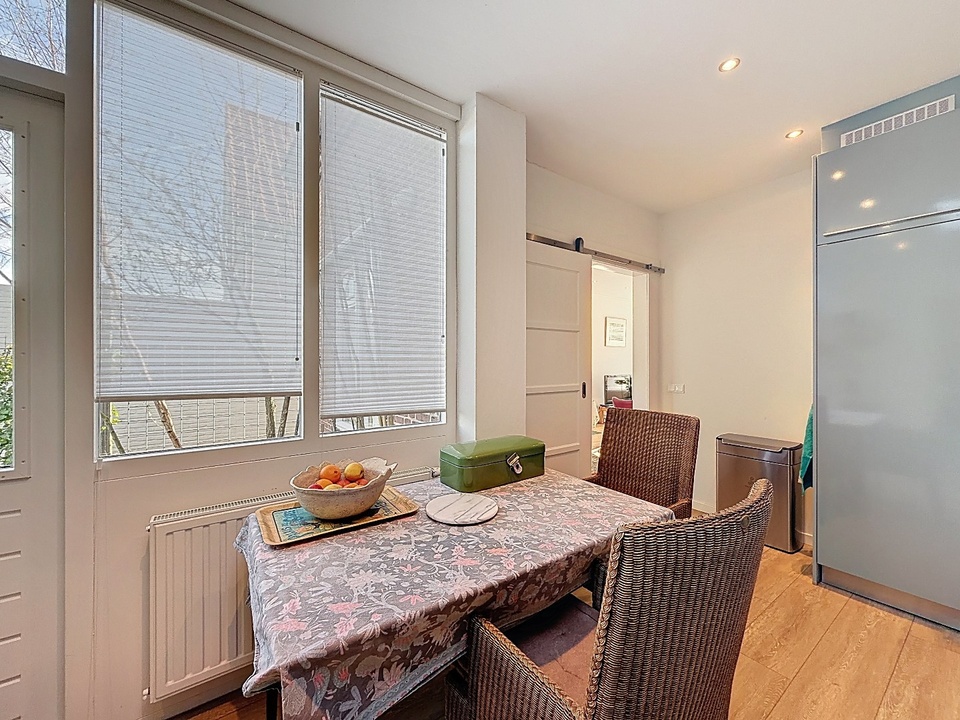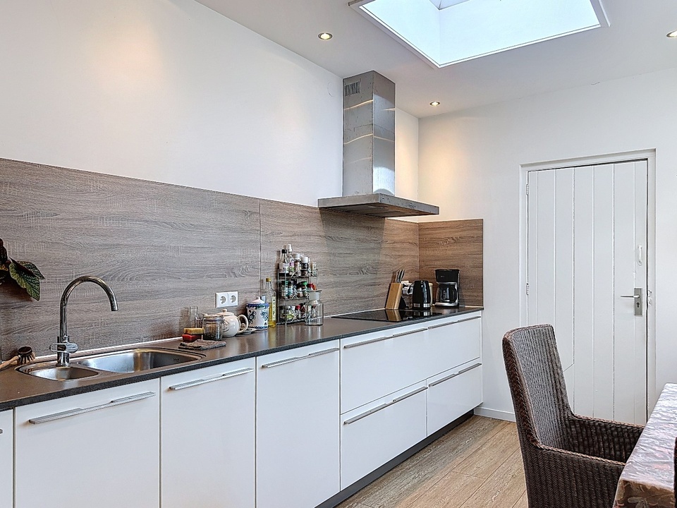 De woonkamer loopt vloeiend over in de eetruimte en de keuken, wat zorgt voor een moderne en open leefindeling. De keuken is strak uitgevoerd en praktisch ingericht met diverse inbouwapparatuur en voldoende werkruimte. Dankzij de lichtstraat geniet u hier van veel daglicht.