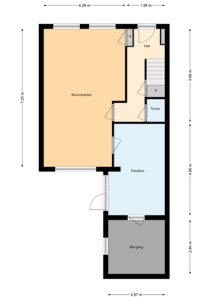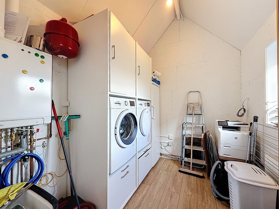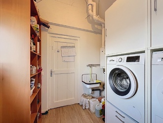 Aansluitend bevindt zich een bijkeuken met aansluitingen voor wasmachine en droger en extra bergruimte. Op de begane grond zijn tevens een toilet en kelder aanwezig.