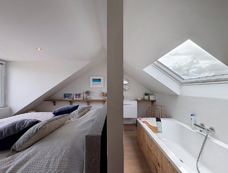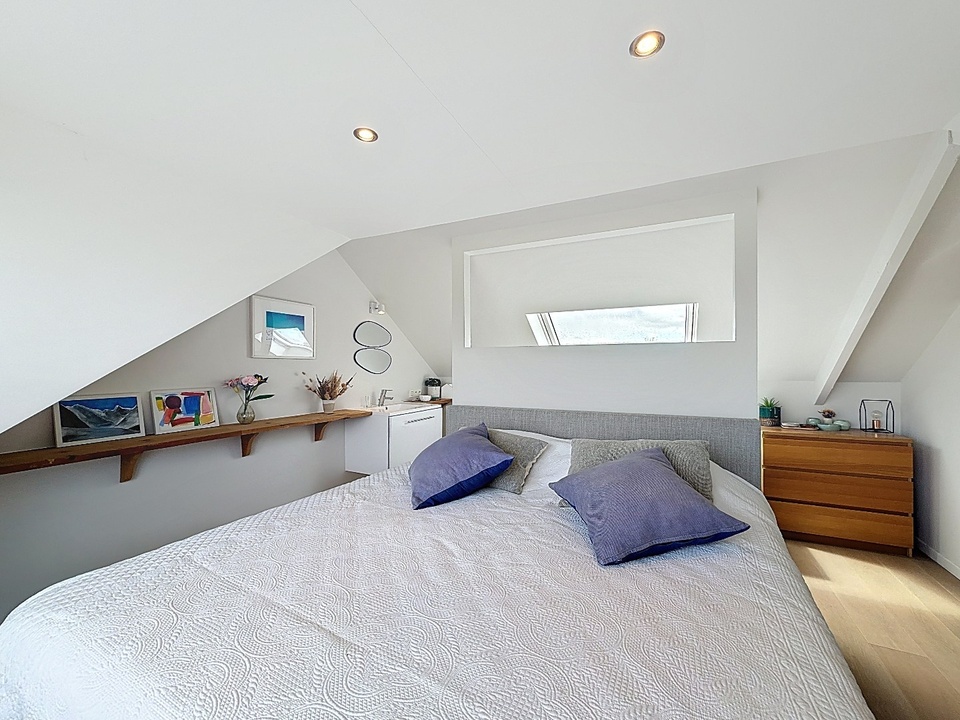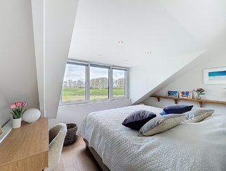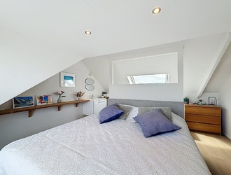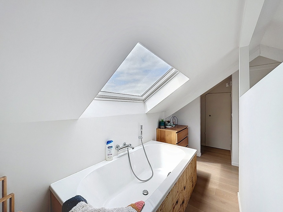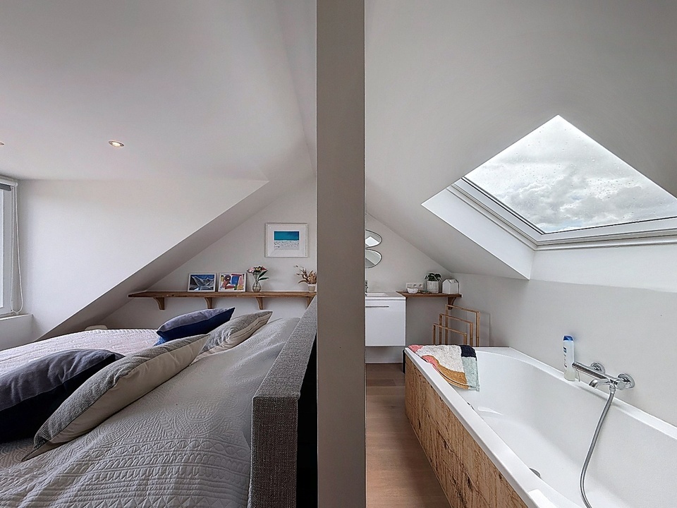 De tweede verdieping vormt een echte verrassing. Hier bevindt zich een royale master bedroom met een luxe en-suite badkamer. Deze verdieping voelt als een privésuite, compleet met ligbad, wastafelmeubel en een separaat toilet. De dakkapel zorgt voor extra ruimte en een aangename lichtinval, wat bijdraagt aan het gevoel van comfort en luxe.